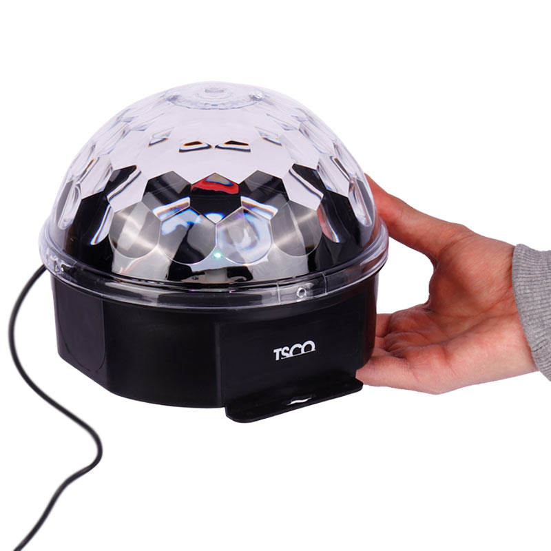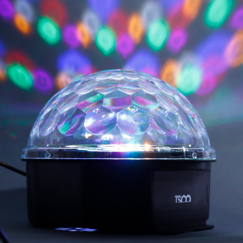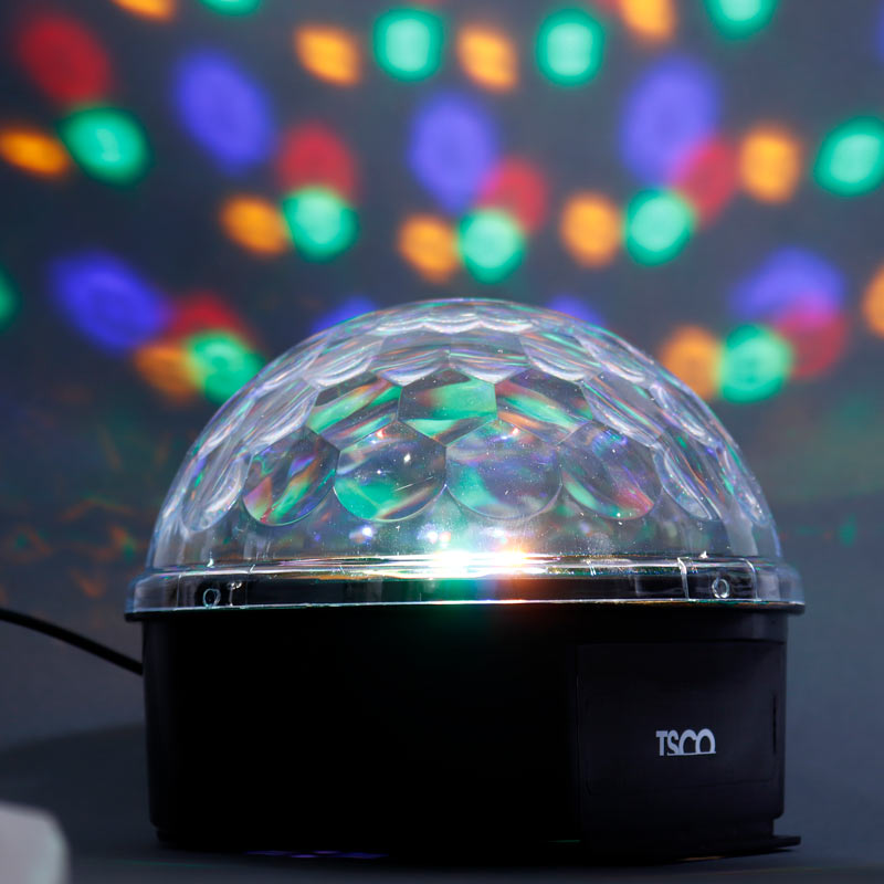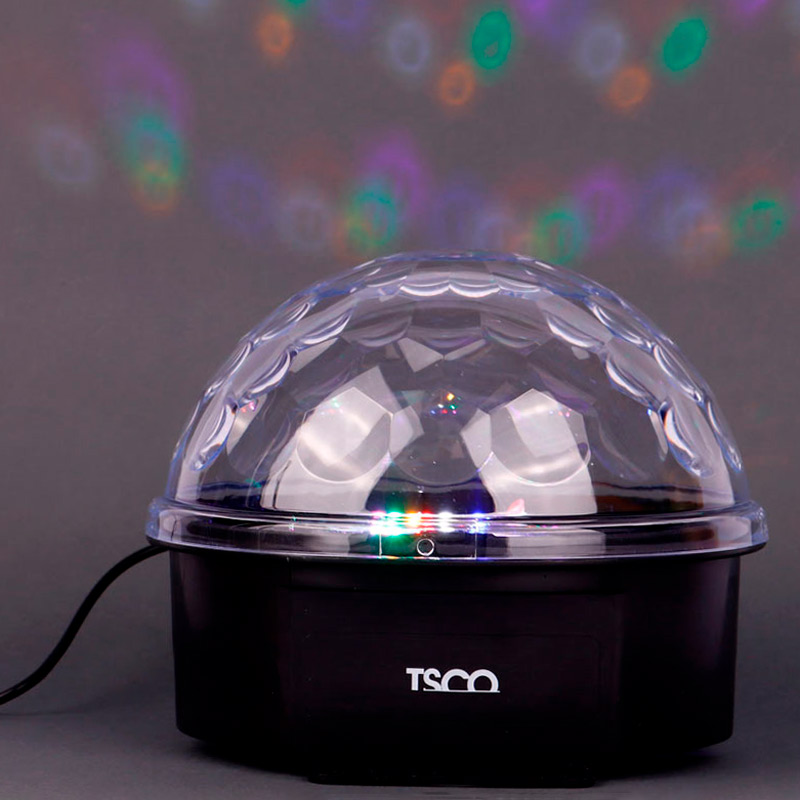 این چراغ که شبیه به یک توپ شیشهای کریستالی است هماهنگ با آهنگ در حال پخش از دستگاه نور افشانی میکند. رقص نور تسکو دارای 9 ال ای دی و 9 رنگ مختلف است که زیبایی فراوانی خلق میکند. ابعاد این رقص نور در حدود 18x18x15 است و فضای زیادی به خود اختصاص نمیدهد. وزنی هم برابر 300 گرم دارد و حمل آن و جابهجا کردنش در محیط سخت نیست.