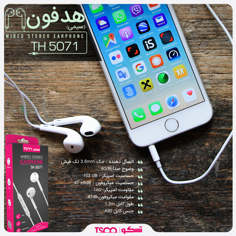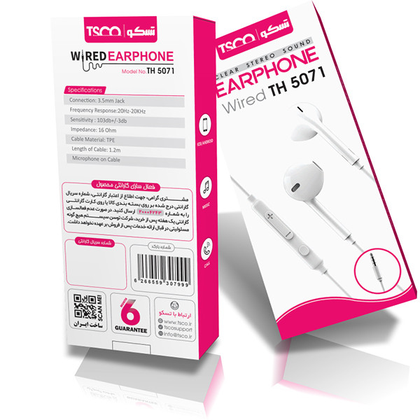 هدفون «TH 5071» محصولی دیگر از TSCO است که جزو هدفونهای توگوشی یا ایرفون (Earphone) بهشمار میرود. به منظور استفاده از این محصول کافی است جک ایرفون 3.5 میلیمتری آن را به گوشی هوشمند خود متصل کرده و از تجربه گوش دادن به موسیقی لذت ببرید؛ همچنین با استفاده از طول کابل 1.2 متری این محصول، استفاده از آن آسانتر شده و میتوانید به راحتی گوشی موبایل خود را درون جیب و یا کیف خود قرار دهید.