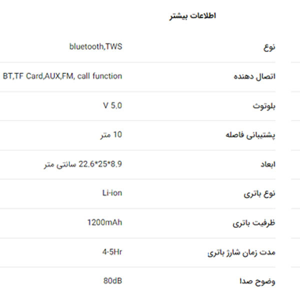 بهره مند از نسخه بلوتوث 5.0 و برد 10 متری،مجهز به فناوری TWS و دارای قابلیت پاسخگویی به تماس های ورودی شما است. باتری این محصول از نوع لیتیوم یون 1200 میلی آمپری است که در مدت زمان 4 الی 5 ساعت فول شارژ میشود.توان واقعی این محصول 5x2 وات با وضوح صدای 80DB میباشد.