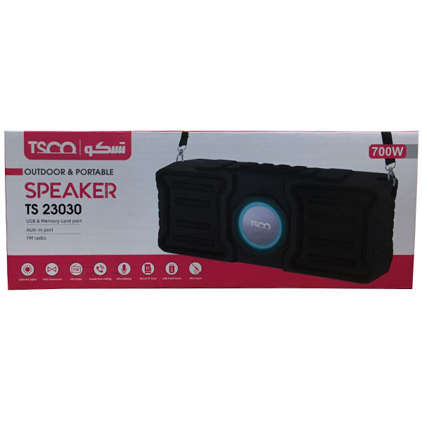 اسپیکر تسکو مدل TS 23030 در ابعاد 8.9x25x22.6 سانتی متر،وزن 471 گرم در رنگ مشکی عرضه شده.این محصول از طریق بلوتوث،پورت USB،درگاه TF CARD و درگاه AUX قابل اتصال و پخش موسیقی است، همچنین رادیو FM را نیز پشتیبانی میکند.