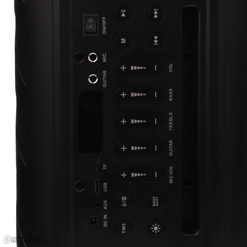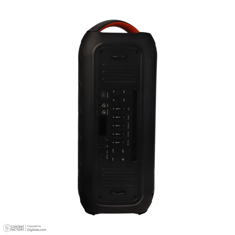| سایر مشخصات | دارای دکمه های تقویت کنندههای بیس و تنظیم صدای با فرکانس بالا یا همان صدای زیر و تنظیم بیس و TWS و تنظیم حالت نور اسپیکر بر روی بدنه اسپیکر/دارای قابلیت ضبط صدا با استفاده از میکروفون/دارای درگاه جک 6.3 میلیمتر مناسب اتصال گیتار به اسپیکر/دارای پورت های USB و USB-C و کارت حافظه و میکروفون/دارای نشانگر LCD بر روی بدنه |