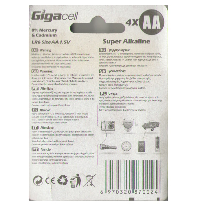 در بستهبندی این مدل 4 عدد باتری قلمی وجود دارد و هر یک از باتریهای موجود در بستهبندی این مدل 1.5 ولتی است. باتریهای قلمی که با نام AA نیز شناخته می شوند منبع انرژی قابلاطمینانی برای دستگاههای الکترونیکی مانند ریموت کنترل، اسباببازی، چراغ قوه و دیگر دستگاههایی از این قبیل محسوب میشوند. البته باید توجه داشته باشید که مدل «Alkaline» از سری باتریهای گیگاسل قابلیت شارژ مجدد ندارند و پس از اتمام انرژیشان باید باتریهای جدیدی تهیه کنید.