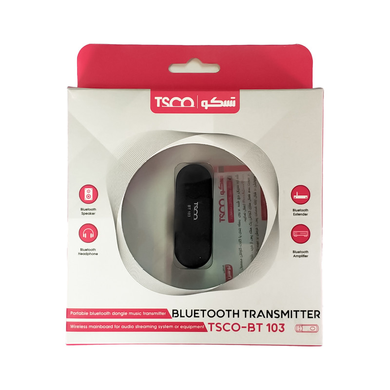 دانگل بلوتوث مدل BT 103 محصولی از برند تسکو است که قابلیت اتصال به هدست و اسپیکر بلوتوث را داراست و مناسب برای انتقال صدای TV به تمامی اسپیکرها و هدست های دارای بلوتوث می باشد .