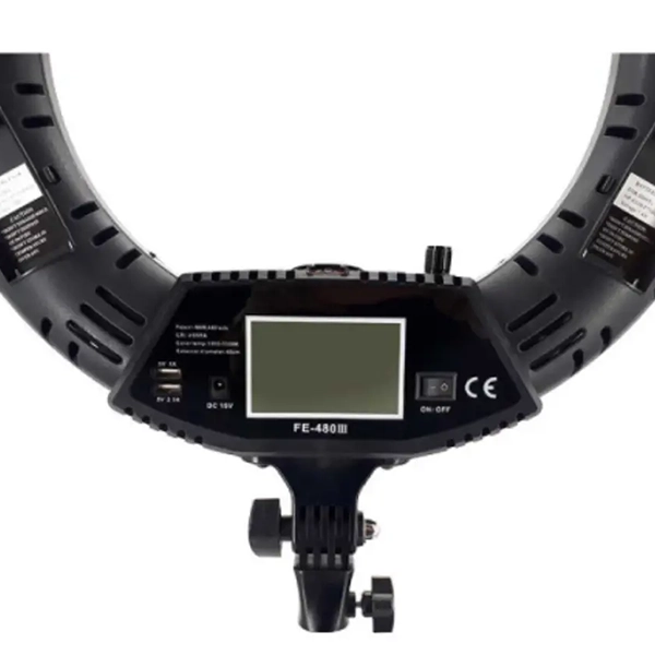 رینگ لایت حرفهای هیرو مدل FE-480 III با قدرت 100 وات و قطر 18 اینچ. مجهز به نمایشگر LCD، پورت USB، ریموت کنترل، آینه و کیف حمل. نورپردازی بینقص برای تولید محتوا و آرایشگاه.