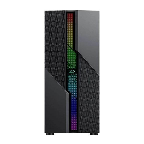 - ✔️ طراحی مدرن و نورپردازی یکپارچه: پنل جلویی با طراحی خاص و یک نوار نوری ARGB، هماهنگی کاملی با فن پشتی ایجاد کرده و ظاهری جسور و تهاجمی به کیس میبخشد. نورپردازی این کیس کاملاً قابل کنترل و هماهنگسازی (Sync) است.