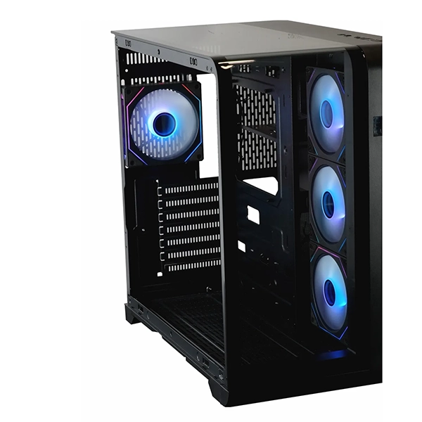 - ✔️ خنککنندگی استثنایی: دارای ۴ فن 120mm ARGB نصب شده (سه فن Reverse Blade در کنار و یک فن در پشت) که ضمن ایجاد جریان هوای فوقالعاده، زیبایی نورپردازی را از هر زاویهای حفظ میکنند.