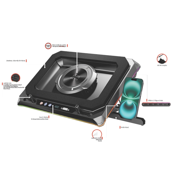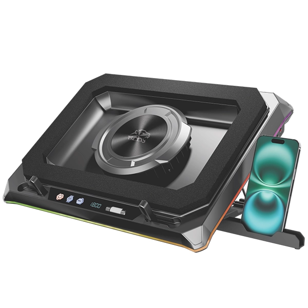 با پنل کنترلی که در جلوی این کولپد تعبیه شده، همه چیز در دستان شماست. به راحتی میتوانید سرعت چرخش فن را در ۶ سطح مختلف تنظیم کنید تا تعادل ایدهآل بین قدرت خنککنندگی و صدای تولیدی را پیدا کنید. همچنین، نورپردازی دینامیک RGB که دور تا دور کولپد را فرا گرفته، با چندین حالت نوری جذاب، جلوهای بینظیر به میز کار شما میبخشد که میتوانید آن را نیز از طریق همین پنل مدیریت کنید.