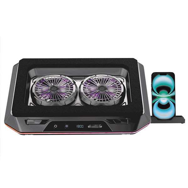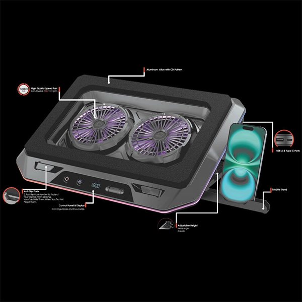 - ✔️ دو فن توربوی قدرتمند: مجهز به دو فن بزرگ و پرسرعت که قابلیت تنظیم دور موتور از ۳۰۰ تا ۱۸۰۰ دور در دقیقه را دارند. این فنها با ایجاد جریان هوای متمرکز و قدرتمند، داغترین قطعات لپتاپ شما را به سرعت خنک میکنند.