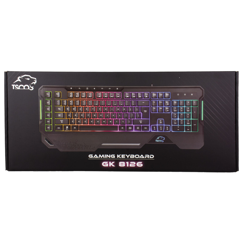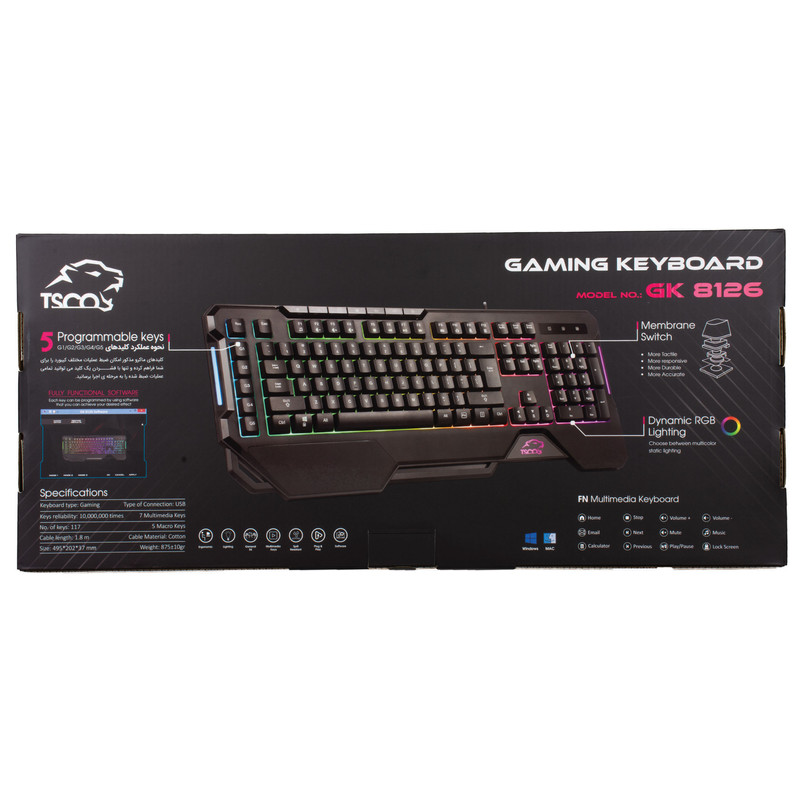 کیبورد گیمینگ ممبران GK 8126 محصولی با طراحی جذاب و ارگونومیک، از محصولات تسکو گیمینگ، یک کیبورد سیمی است که در ادامه به بررسی آن میپردازیم: این کیبورد توسط یک سیم از جنس کتان بافته شده به طول 1.8 متر و از طریق درگاه USB به دستگاه شما متصل می شود. این کیبورد جذاب با استفاده از 110 کلید به همراه 17 کلید مولتی مدیا و 5 کلید(G1-G5) ماکرو در خدمت شما خواهد بود.