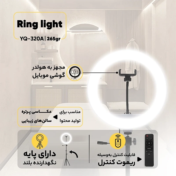 - ✔️ ریموت کنترل برای راحتی بیشتر: بدون نیاز به دست زدن به رینگ لایت، تمام تنظیمات نور و رنگ را از راه دور با ریموت کنترل همراه محصول مدیریت کنید.