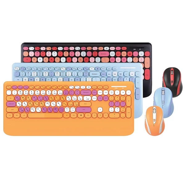 - طراحی چشمنواز و رنگبندی منحصر به فرد: این ست در چندین ترکیب رنگی فوقالعاده (مانند آبی-بنفش، مشکی-قرمز-صورتی، و نارنجی-صورتی) عرضه میشود تا با هر سلیقهای سازگار باشد. کلیدهای دایرهای و جزیرهای کیبورد، علاوه بر زیبایی، تجربهی تایپی نرم، دقیق و کمصدا را فراهم میکنند.
