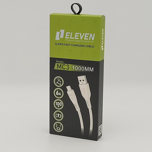 کابل شارژ Micro USB مدل MC3 توسط شرکت ELEVEN ساخته شده است. استانداردهایی که در این کابل به کار رفته باعث می شود تا آداپتور شما بتواند عملیات شارژ خود را به درستی انجام دهد و باعث افزایش عمر باتری دستگاه شما میشود. و میتواند تمام دستگاههایی که دارای ورودی Micro USB هستند را با شدت جریان 6 آمپری و سرعت بالایی شارژ کند و یا با اتصال به کامپیوتر انتقال اطلاعات انجام دهد. این کابل با 100 وات توان انتقال قدرت، به راحتی از تمام شارژر های فست شارژ پشتیبانی میکند.