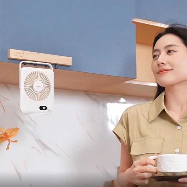 - استفاده دوگانه (رومیزی و آویز): پایه هوشمند این پنکه تا 180 درجه میچرخد و به شما امکان میدهد آن را روی میز قرار دهید یا از لبه مانیتور، قفسه و هر جای دیگری آویزان کنید.