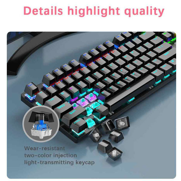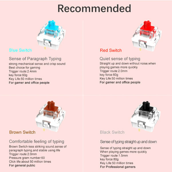 کلیدهای آن دارای مقاومت متوسط ، صدای کلیک قابل شنیدن و بازخورد لمسی هستند . صفحه کلیدهای کلاسیک مانند ماشین تحریر کلاسیک به نظر می رسند که احساس تایپ و لمس کلیک راحت را برای شما به ارمغان می آورد . از صفحه کلید مخصوص بازی RGB برای ارتقاء فضای بازی استفاده میشود. این صفحه کلید دارای طراحی دکمه های ارگونومیک می باشد و در استفاده طولانی مدت شما احساس خستگی نمی کنید .