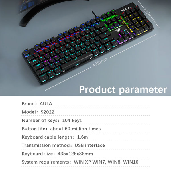 اگر شما هم جزء گیمیر های حرفه ای و موفق هستید حتما نیاز به یک کیبورد باکیفیت دارید تا بتوانید از بازی کردن لذت ببرید . کیبورد گیمینگ AULA Mountion S2022 مخصوص بازی با نور پس زمینه و پوشش آلیاژ آلومینیومی درجه یک ساخته شده است تا تصمیم قاطع شما برای برخورداری از کیفیت عالی را جلوه گر سازد . کیبورد AULA S2022 با سبک ماشین تحریر و کلیدهای با ارتفاع بیشتر که عمل فشردن دکمه ها را راحت تر میکند برای گیمیر های حرفه ای طراحی و تولید شده است .