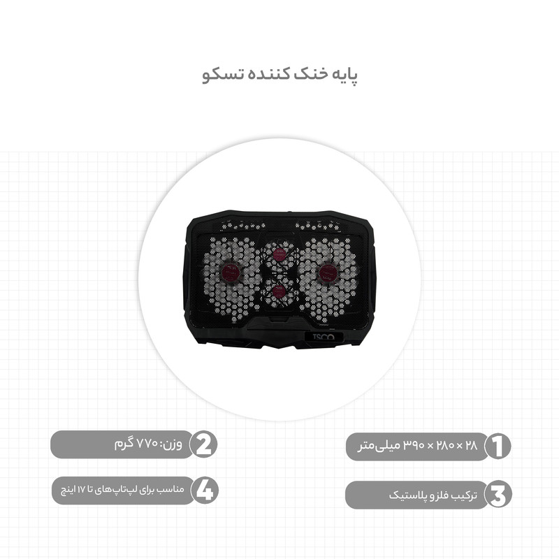 بهاینترتیب نقش موثری در پایین آوردن دمای لپتاپ دارند. تسکو برای فنهای بهکار رفته در این کولپد نشانگرهای LED با رنگ آبی قرار داده تا با استفاده از آنها وضعیت خنککننده مشخص شود.