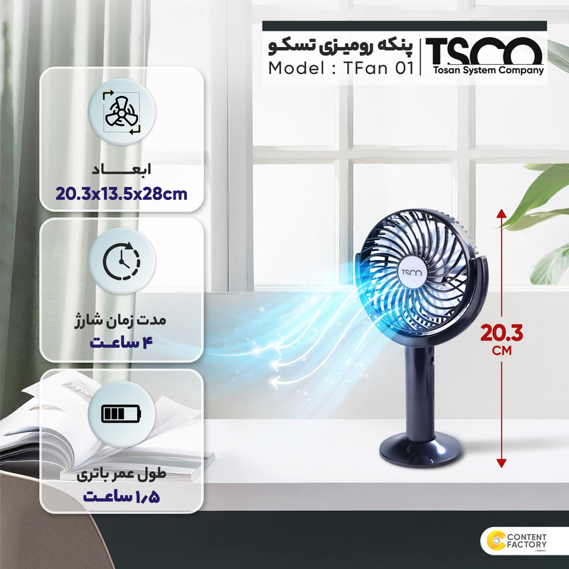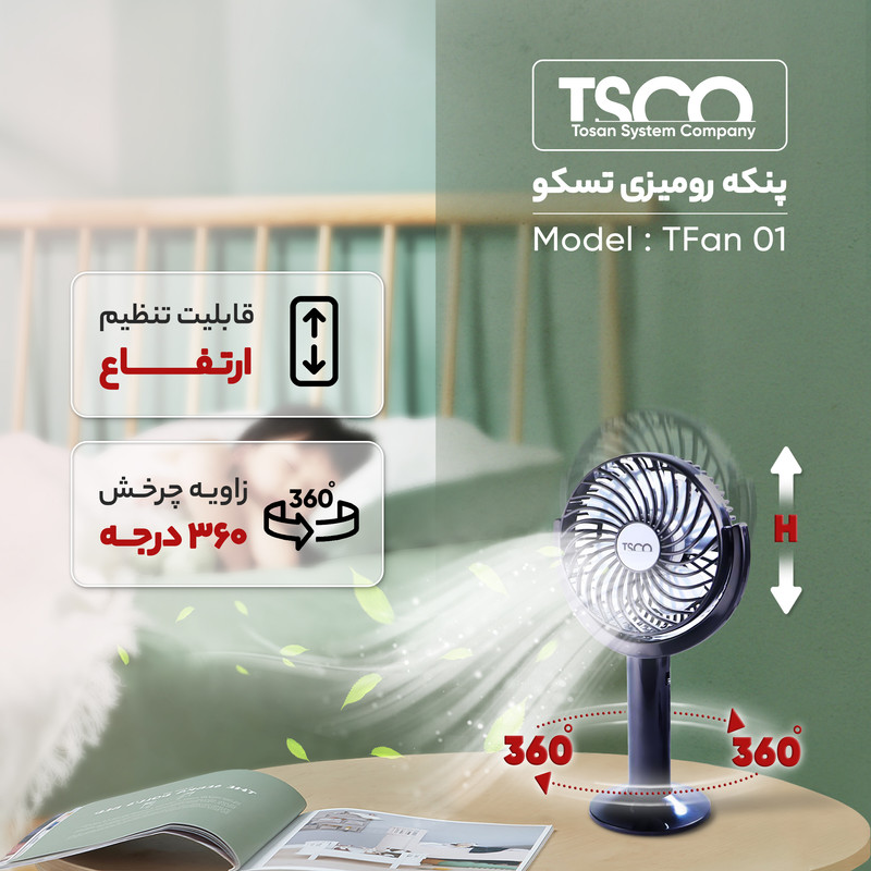 پنکه رومیزی تسکو مدل TFan 01 از جمله ابزارهایی است که به شما کمک میکند تا بتوانید فضای مطبوعی در اتاق یا محل کارتان برای خود بهوجود بیاورید. ابعاداین پنکه درحدود 20.3x13.5x28 سانتیمتر بوده و وزن آن 177 گرم است. این پنکه دارای قابلیت تنظیم ارتفاع بوده و میتوانید به دلخواه آن را تنظیم کنید و در مکانهای مختلف اتاقتان قرار دهید.