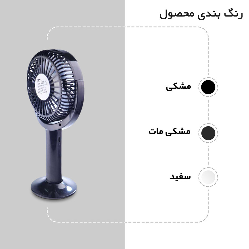 | سایر توضیحات | با مدت زمان شارژ باتری: 4 ساعت- طول عمر باتری: 1.5 ساعت- دارای دو حالت سرعت فن- سرعت فن: 4000RPM- ظرفیت باتری: 1200 میلی آمپر ساعت- ولتاژ ورودی: DC 5V |