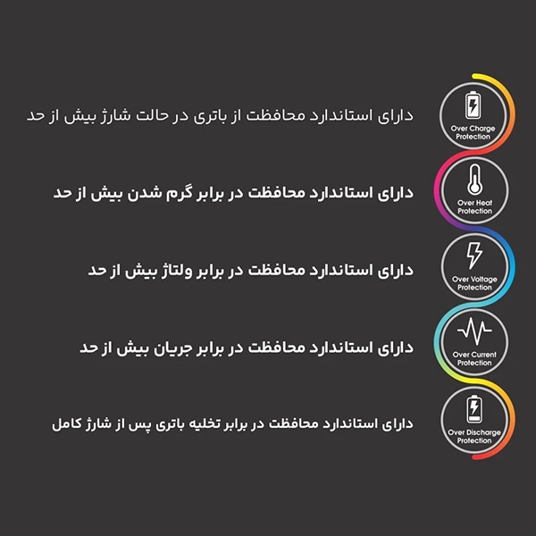 | مدارهای حفاظتی | محافظت در برابر شارژ بیش از حد، ولتاژ/جریان بیش از حد، اتصال کوتاه و گرما |