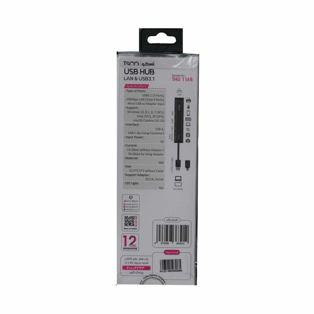 | توضیحات بیشتر | پشتیبانی از 3* USB3.1 (gen1)، پشتیبانی از آداپتور 5V/2A برای اتصال Lan و 3 دستگاه به طور همزمان (برای مثال 3 هارد خارجی) |
