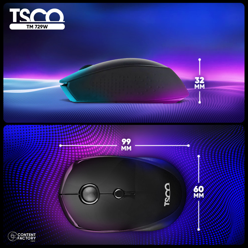 موس TM 729W یک ماوس بی سیم (وایرلس) جمعوجور با وزن سبک از شرکت تسکو است و برای استفاده در کنار لپ تاپ یا کامپیوترهای رندر انتخاب بسیار مناسبی است و شما به راحتی میتوانید آن را درون کیف لپتاپ خود قرار دهید تا همیشه این ماوس را در کنار لپ تاپ خود، به همراه داشته باشید. این ماوس دارای قابلیت منحصر بهفرد کلیدهای بی صدا «سایلنت» است. ماوس TM 729W تسکو یک ماوس وایرلس 4 کلیده بوده و مکانیابی را با استفاده از یک حسگر اپتیکال انجام میدهد و قادر است 1600 نقطه در اینچ را مکانیابی کند.
