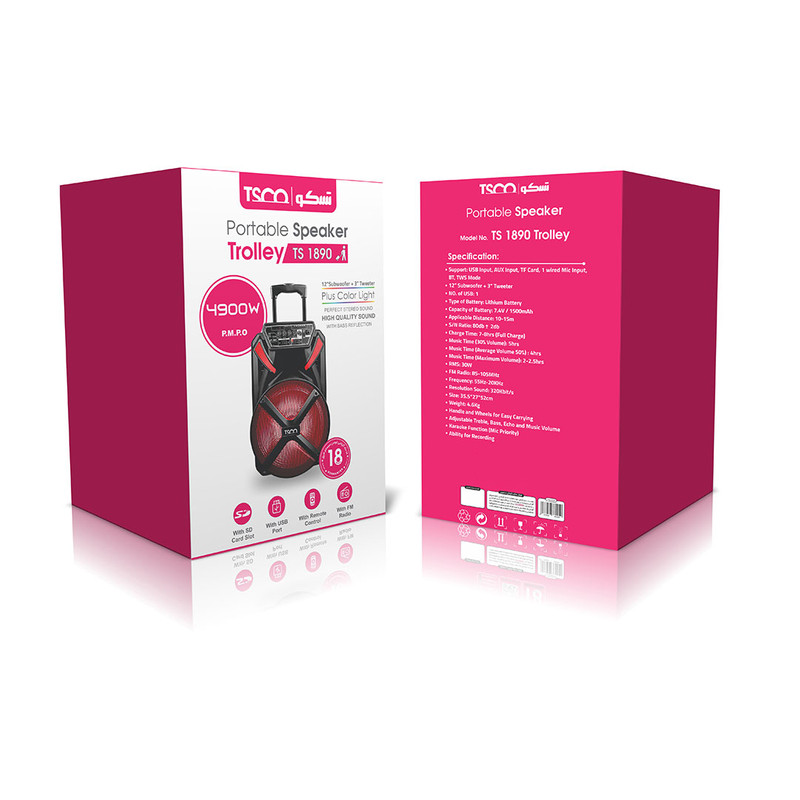 | مشخصات دیگر | توان اسمی (P.M.P.O): 4900W /توان واقعی: 30W /قدرت تفکیک صدا: 320 /دارای صفحه نمایش وضعیت /پشتیبانی از BT، USB، AUX، FM، TF Card، Wired Microphone، Wireless Microphone /قابلیت ضبط و TWS /دارای یک ورودی میکرفون سیمی /دو چرخ و دسته برای حمل آسان /دارای ولوم کنترل ECO، ولوم BASS و TREBLE |