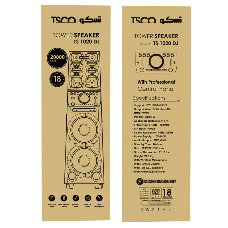 TS1020DJ از فرمتهای صوتی MP3 و WMA پشتیبانی میکند. همچنین بلوتوث که جذابترین راه ارتباطی این محصول محسوب میشود، امکان انتقال بیسیم فایلهای صوتی را به اسپیکر فراهم میکند. از این طریق به راحتی میتوان موبایل یا تبلت را به اسپیکر متصل کرد و فایلهای صوتی دلخواه را از اسپیکر شنید. یکی از قابلیتهای جذاب این اسپیکر، کارائوکه است. با اتصال یک میکروفون به این سیستم میتوانید خوانندگی را تجربه کنید. البته برای بهرهمندی از این قابلیت باید فایل صوتی مخصوص را داشته باشید. منبعتغذیهی این اسپیکر از طریق اتصال به برق تامین میشود.
