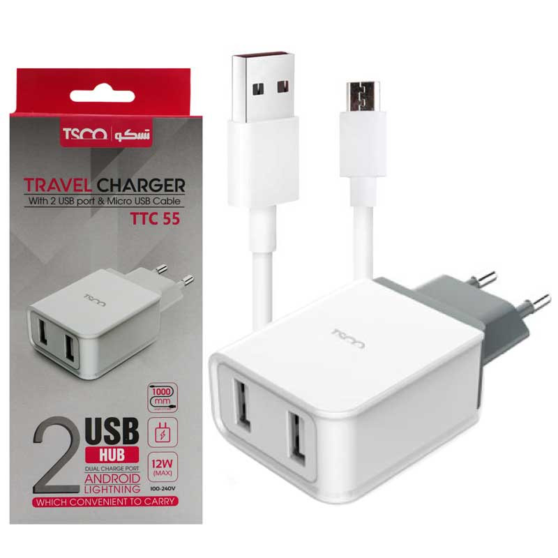 شارژر دیواری TTC 55 از سری محصولات برند تسکو است . بر روی این شارژر دیواری 2 درگاه خروجی USB 2.0 تعبیه شده است .شدت جریان خروجی درگاههای USB این محصول 2.4 آمپر بوده که برای شارژ تبلت مناسب است.شما میتوانید همزمان دو دستگاه الکترونیکی خود از قبیل تبلت و موبایل را با این محصول شارژ کنید. این شارژر دیواری خوش ساخت از ترکیب پلاستیک ABS و پلی کربنات تولید میشود.گفتنی است دوشاخهی TTC 55 از نوع (EU) بوده و برای استفاده از پریزهای برق رایج در ایران نیاز مبدل ندارید. ولتاژ ورودی شارژر دیواری باسئوس 100 تا 240 ولت است. طول این شارژر دیواری 54 میلیمتر است و بهراحتی میتوان آن را در فضاهای کوچک جا داد و یک ابزار کاربردی برای کسانی است که علاوه بر گوشی موبایل از تبلت هم استفاده میکنند.