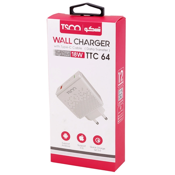 با شارژر 18 واتی تسکو TTC 64 و تکنولوژی QC3.0، گوشی خود را 4 برابر سریعتر شارژ کنید! این پکیج کامل همراه با کابل Type-C، انتخابی ایدهآل برای شارژ سریع و ایمن انواع دستگاههاست.