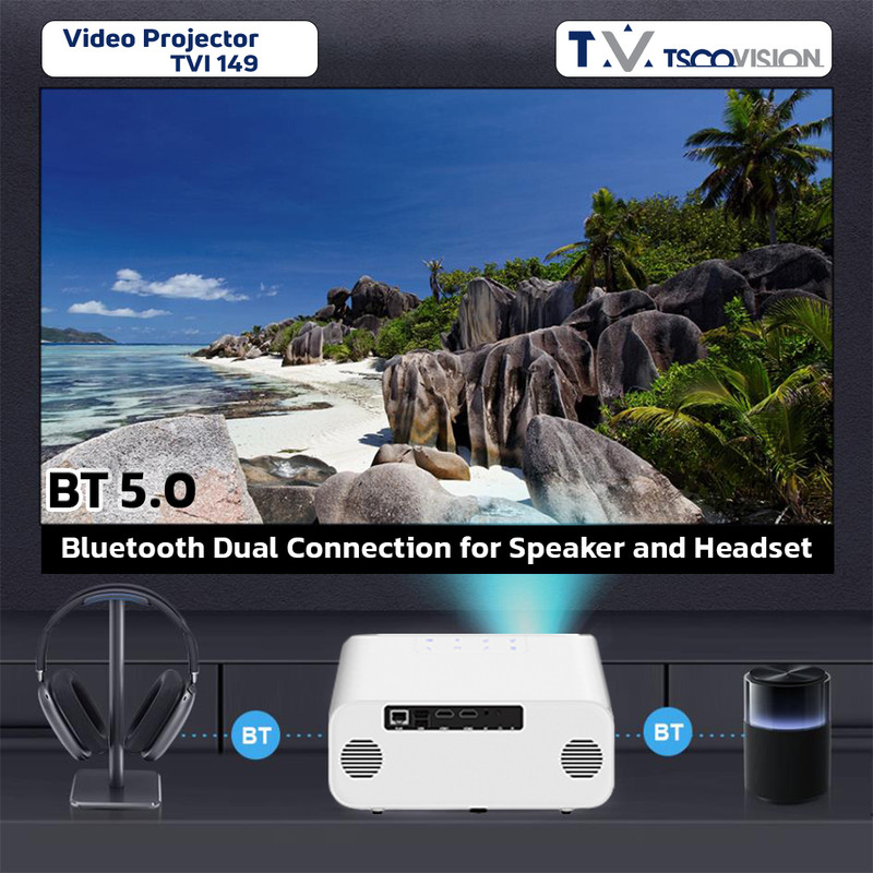 روشنایی 350ANSI Lumens این دستگاه، نمایش تصاویری واضح و شفاف را حتی در محیطهای نسبتاً روشن امکانپذیر میکند. در شرایط ایدهآل (اتاق تاریک)، این میزان روشنایی برای تماشای فیلم، بازی، و ارائههای حرفهای کاملاً مناسب است. طول عمر 50,000 ساعت در حالت ECO باعث میشود که کاربران بتوانند سالها بدون نیاز به تعویض لامپ، از این دستگاه استفاده کنند.این ویژگی به کاهش هزینههای تعمیر و نگهداری کمک میکند و ارزش خرید دستگاه را افزایش میدهد.مصرف انرژی این ویدئو پروژکتور هوشمند تسکوویژن (TSCOVISION)، 95 وات بوده که در مقایسه با بسیاری از پروژکتورهای همرده، مصرف مناسبی به حساب میآید.همچنین، ورودی برق AC 110V-240V/2A باعث شده که این دستگاه در مناطق مختلف دنیا بدون نیاز به مبدل ولتاژ قابل استفاده باشد. این ویدئو پروژکتور هوشمند تسکوویژن (TSCOVISION) به دو عدد اسپیکر داخلی با توان 5 وات (مجموع 10 وات) مجهز شده است که صدایی شفاف و قابل قبول ارائه میدهد. البته، برای تجربهی صوتی بهتر، میتوان از خروجی AUDIO OUT برای اتصال سیستمهای صوتی خارجی یا از بلوتوث نسخه 5.0 برای اتصال بیسیم به اسپیکرها و هدفونهای بلوتوثی استفاده کرد. پشتیبانی از فناوری Bluetooth 5.0 امکان انتقال صدای باکیفیت و بدون تأخیر را فراهم میکند که این ویژگی برای تماشای فیلم، گوش دادن به موسیقی و اجرای بازیها اهمیت بالایی دارد. ویدئو پروژکتور هوشمند تسکوویژن مدل TVI 149 به دو اسپیکر داخلی با امپدانس 4 اهم و توان خروجی 5 وات (مجموع 10 وات) مجهز شده است که صدایی واضح، قدرتمند و بدون نویز ارائه میدهد. کیفیت صدای بالا، در کنار قابلیت اتصال به اسپیکرهای خارجی از طریق بلوتوث یا خروجی صوتی، تجربهای سینمایی را برای کاربران فراهم میکند.