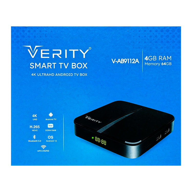 اندروید باکس وریتی مدل V-AB9112 یک دستگاه پخش چندرسانهای پیشرفته است که امکانات زیادی را برای تبدیل تلویزیون معمولی شما به یک تلویزیون هوشمند و پخشکننده رسانههای مختلف ارائه میدهد. با این دستگاه میتوانید به راحتی از خدمات استریم آنلاین، بازیها، اپلیکیشنهای متنوع و همچنین پخش محتوای 4K لذت ببرید.