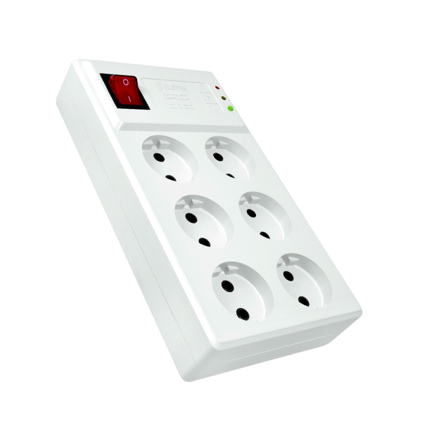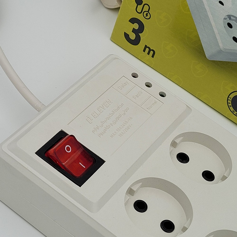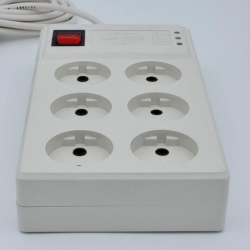چندراهی که در تصویر مشاهده میکنید دارای شش عدد پریز بوده. روی محافظ ایلون VP9006 یک دکمه خاموش و روشن وجود دارد برای اینکه بتوان به راحتی برق را قطع و وصل کرد، از این دکمه میتوان استفاده کرد. نشانگر LED که روی دستگاه تعبیه شده برای نمایش تاخیر و همچنین وضعیت برق است که شما را از برق رسانی با ولتاژ غیراستاندارد مطلع کند.