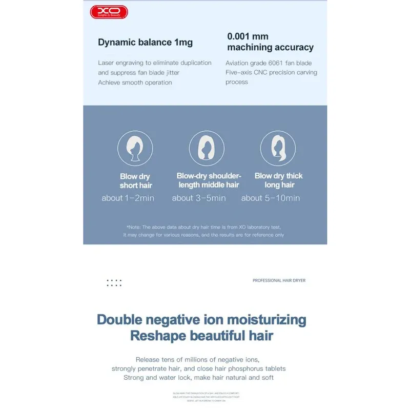 خشک کردن موها نباید به قیمت آسیب دیدن آنها تمام شود. سشوار هوشمند XO مدل CF2 با الهام از طراحی مدرن سشوارهای روز دنیا، ترکیبی از قدرت، زیبایی و سلامت را ارائه میدهد. این محصول با توان خروجی ۱۶۰۰ وات، جریانی قوی از هوا را ایجاد میکند که موها را به سرعت خشک کرده، اما رطوبت طبیعی آنها را حفظ میکند.