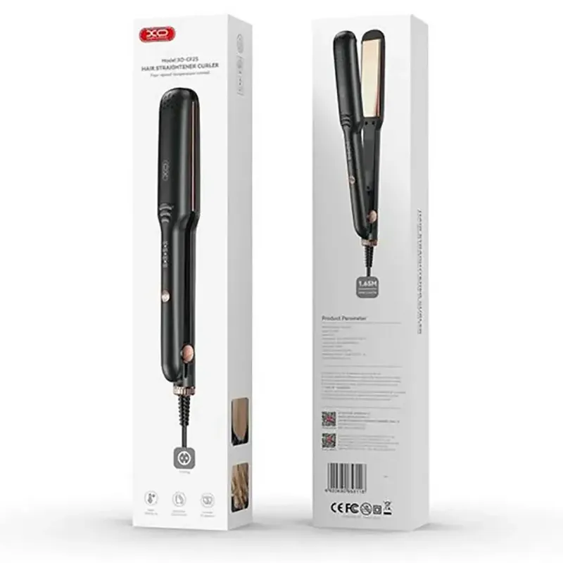 اتو موی حرفهای XO CF25 با قابلیت صاف کردن و فر کردن مو. دارای صفحات با روکش سرامیکی برای جلوگیری از آسیب به مو. قابلیت تنظیم دما در ۴ حالت مختلف. گرمایش سریع (PTC)، طراحی ارگونومیک با رنگ مشکی و رزگلد. کابل ۱.۶۵ متری با چرخش ۳۶۰ درجه برای استفاده آسان.